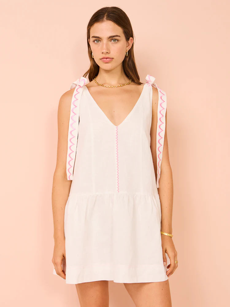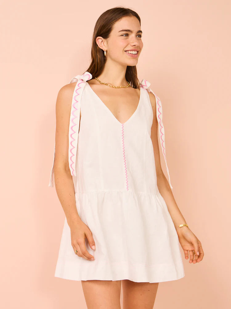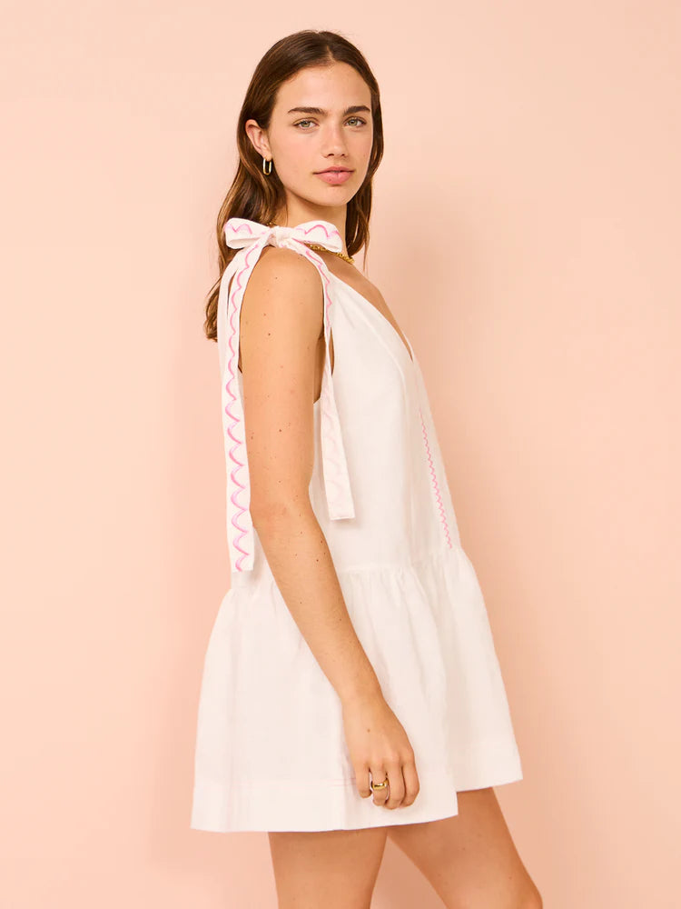 Crafted from a lightweight cotton blend, this mini dress features an oversized silhouette, workable ties at the shoulder with pink scalloped embroidery detail