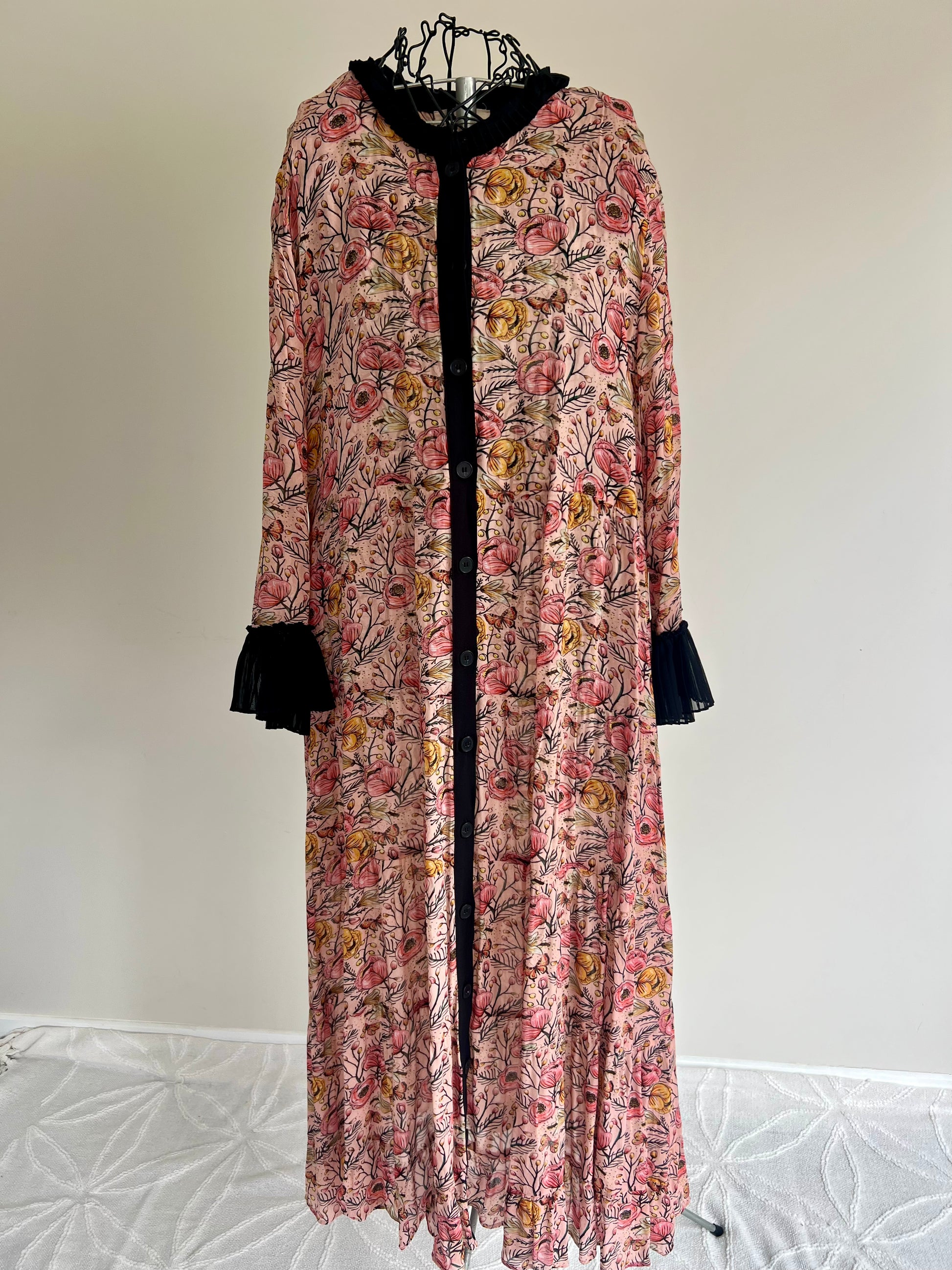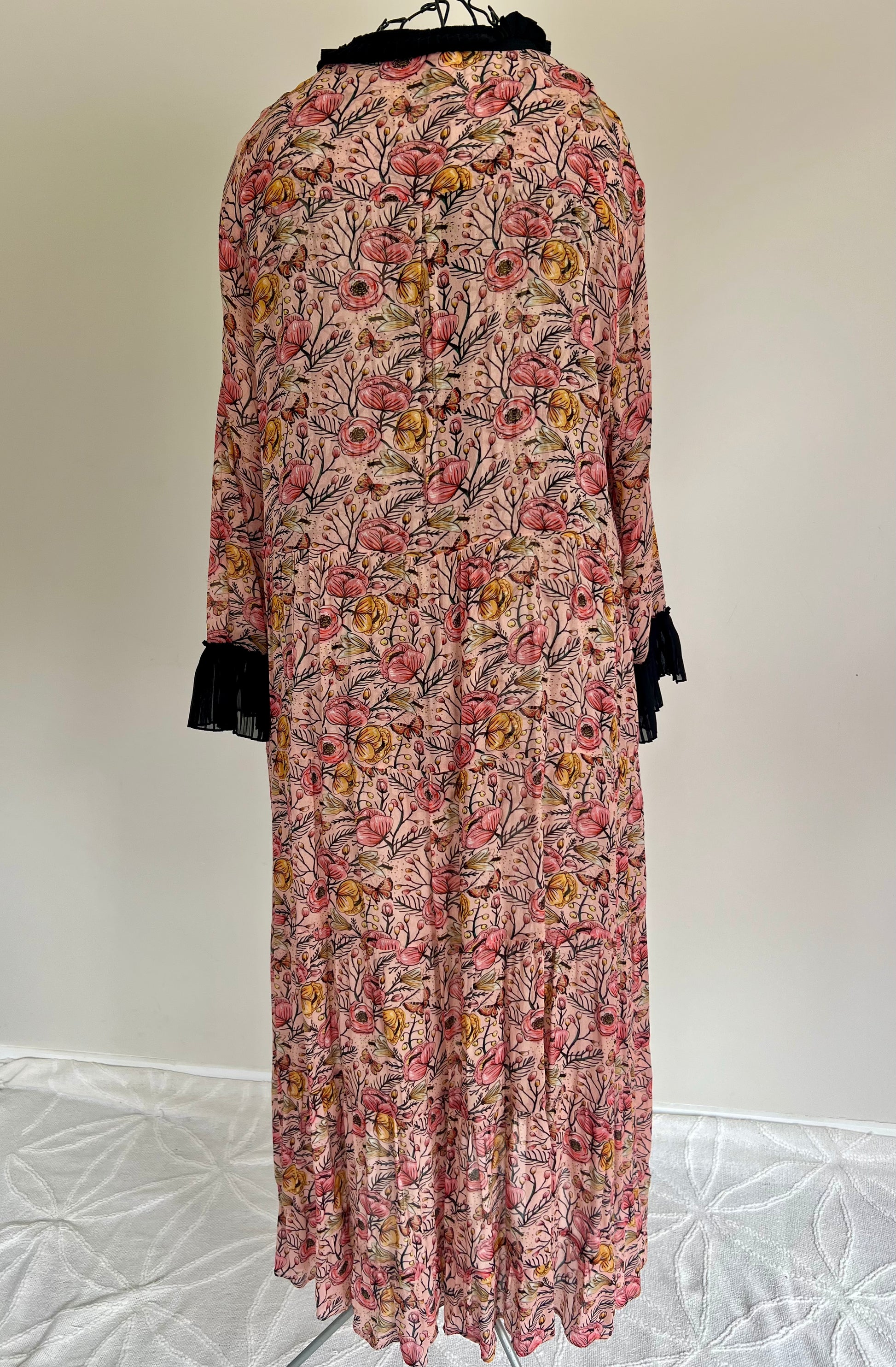 Beautifully detailed floral long dress. Crafted from lightweight, flowing fabric, the dress features an all over botanical print in shades of pink, yellow and black on a soft blush background.